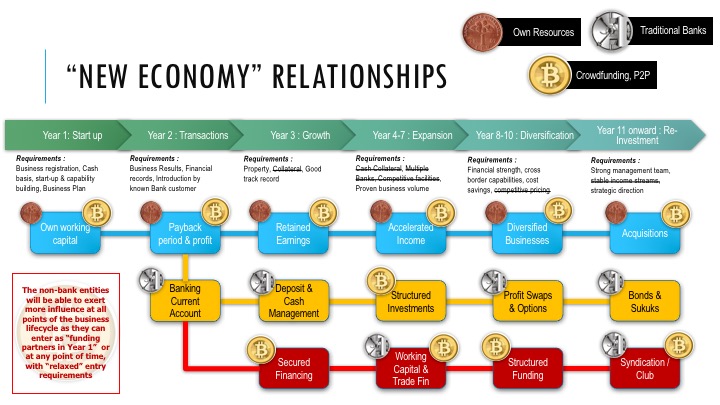 Big Data companies have proven that their database is far more powerful (and valuable) than the database an individual bank would have on its existing customers. Bitcoin and other cryptocurrencies goes through thousands of transactions within blockchain and is only realised into banks network when actual physical cash is needed. eWallet lets value resides in tech platforms for purchasing and sales of goods and services (more like barter or exchange of goods and services), and up to a certain extent provides microfinancing. Prepaid and loaded value arrangement provides free seed funding and capital for businesses, without the cost of borrowing incurred via banks. Peer to Peer (P2P) arrangement links crowdfund Investors to Entrepreneur without complicated documentation with speed and transparency levels never seen before. Sharing of risks and profits (including potential pay-offs) are now more understood as compared to traditional financing arrangements. Mudharabah, Musyarakah, and Ijarah may now have a place in an economy where equity participation is expected and sought after.