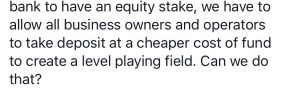 Partners. To be effective when a Bank enters directly into the business world, the Bank will need to hire specialists in the business world, not the banking world. I imagine the Bank would need a huge team of specialists, each specialist able to integrate themselves into multiple industries (there are thousands of industries, and subindustries) just to be a useful and contributing member in the customer’s business or industries. They need to be “partners” rather than bankers. Cost to build such a team (and maintain them) would be significantly huge.