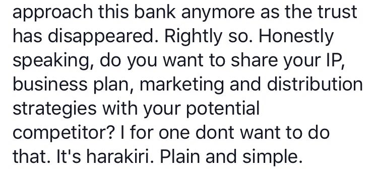 I totally agree with this. Banks are essentially financial intermediaries, which basically means the Banks are in a business where it provides financial products and services that carries a certain risks which will earn a certain returns on its activities. This is what the shareholders of a bank expects. They are not in the business of “joint venture” or “venture capitalists (VC)”, nor are they angel investors or crowd funders. They expect a certain return on their capital, otherwise they will take their capital elsewhere. If the model is a financial intermediary, there needs to be a clear separation of function between a financier and a business owner. Business owner means involvement by Banks in the customer’s business; the way Banks are currently set up are not this. We in the Bank do not have expertise to get ourselves involved directly into a customer’s business.