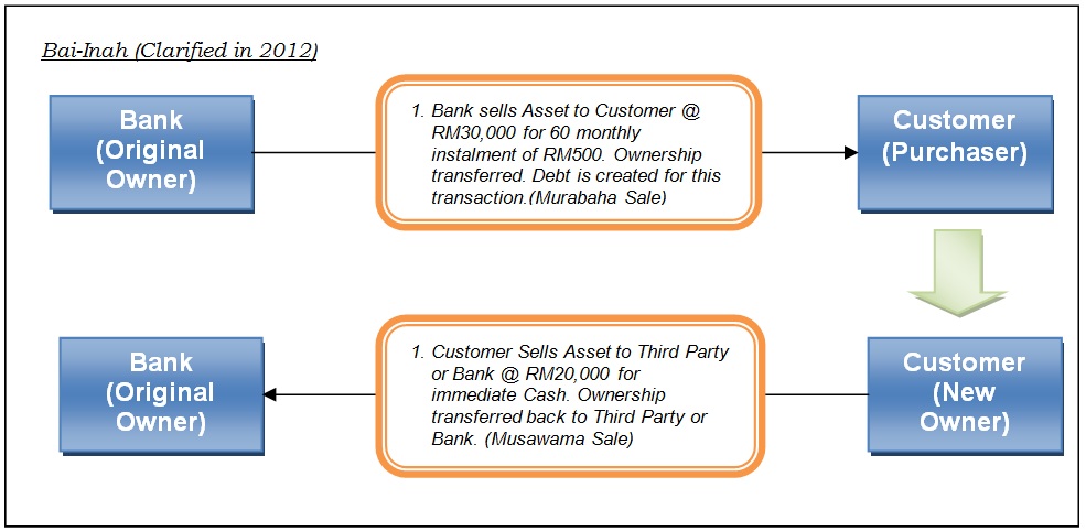 BNM, based on discussions with Sharia scholars, has requested that this interconditionality be removed from Bai Inah documents (and to a larger extent, the Malaysian version of the Bai Bithaman Ajil). This attempts to ensure that Bai-Inah no longer becomes an “arranged” transaction just to validate the creation of debt.