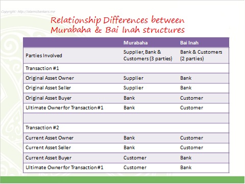 The purpose of both structure is to create debt, and under both structure, cash can be obtained, therefore Bai-Inah can also be used to procure Assets. Also, Bai-Inah is a key component in a re-financing scenario; a customer has fully owned a property but now requires cash or capital, sells the property to the Bank for cash, whom then re-sells the property to the customer at a profit to be settled via instalments.