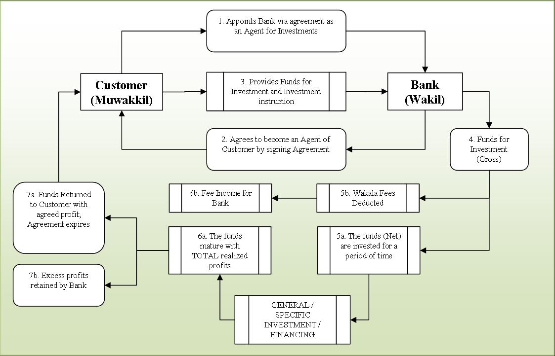 The Wakalah investment structure was introduce to bridge the gap between what customers usually see in a conventional Fixed or Term Deposit structure (where “interest” is fixed upfront) and an Islamic Mudharaba investment account (where actual profits are distributed based on an agreed ratio and therefore cannot be fixed). Via the contract of  Wakala, a Bank is able to specify an expected return from the deposit received from customer (indicative “fixing” of returns) by investing as the customer’s wakil (agent)  into selected instrument for an agreed wakil fee. The Bank (Wakil) makes the investment to generate specific returns, carried out for and on behalf of the customer (Muwakkil).